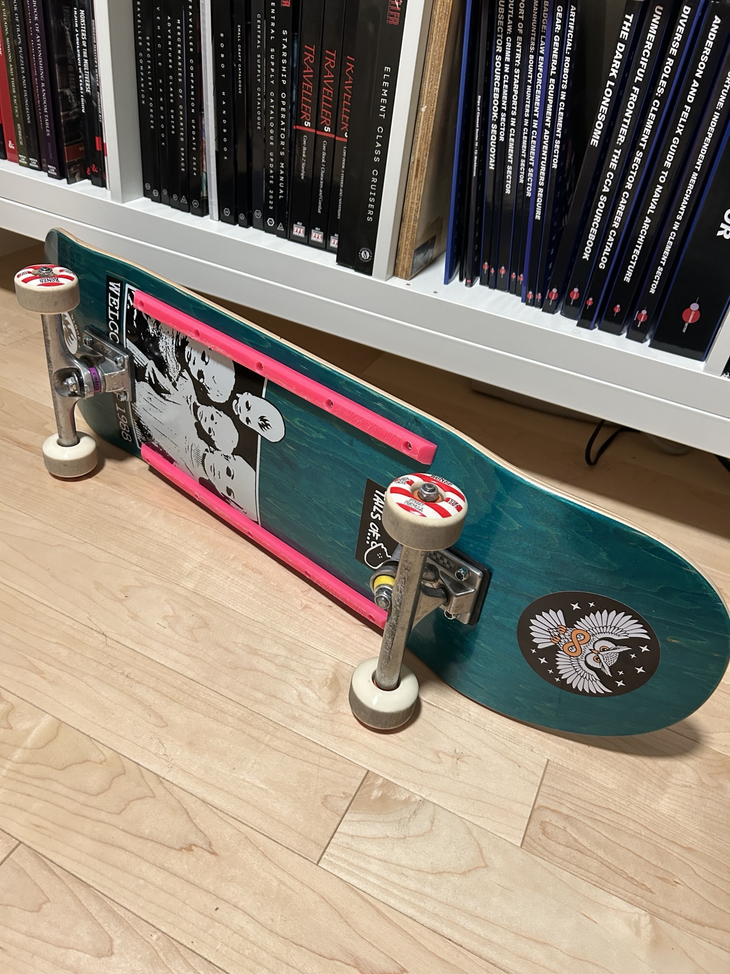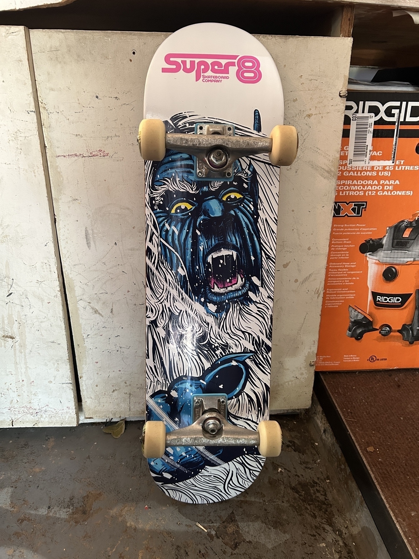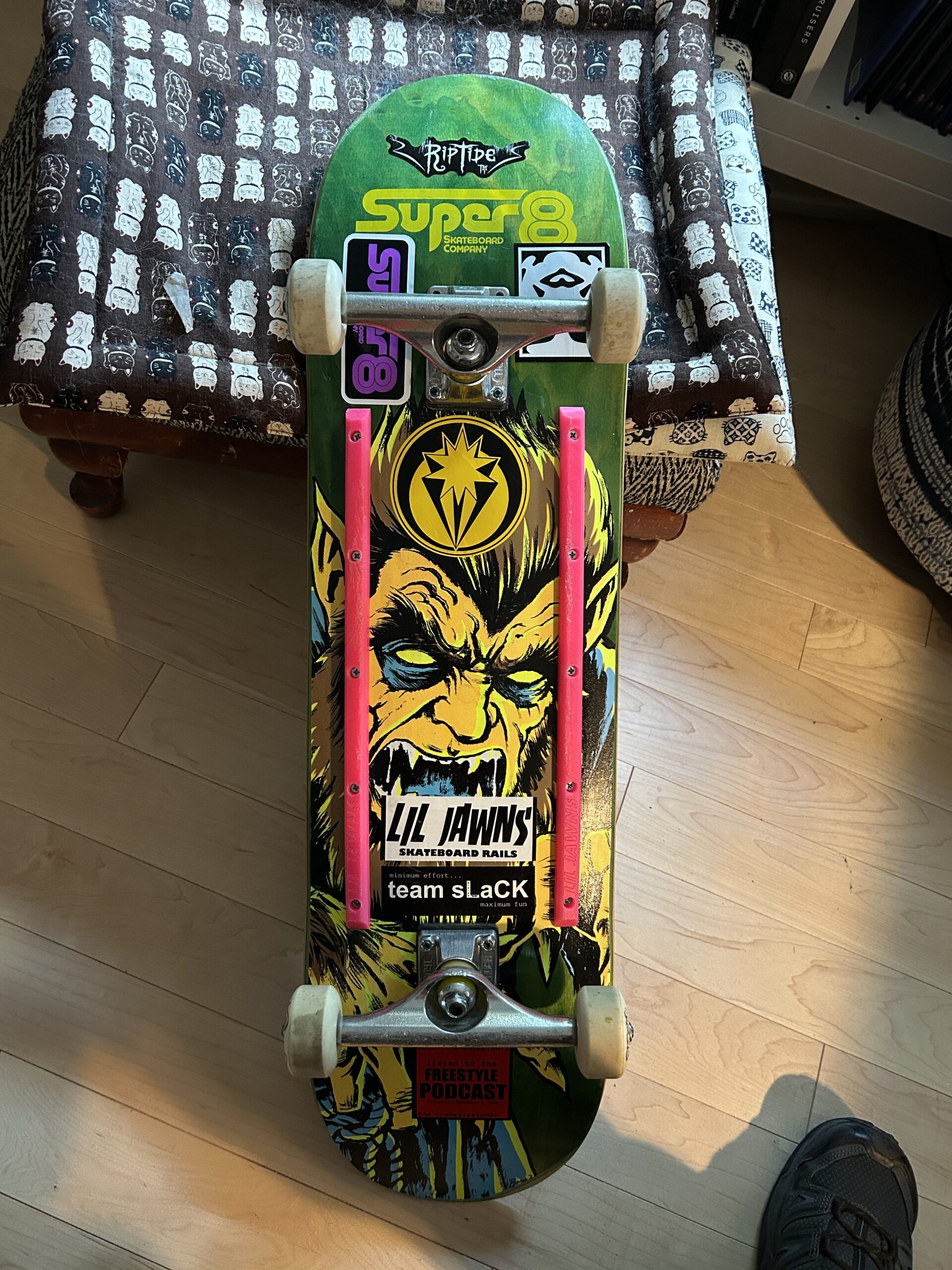 - 8.5″ wide Super-8 pops, Indy 159s, 54mm Bones STF. 1 thin riser. This is a good board for parking-lot style for me.