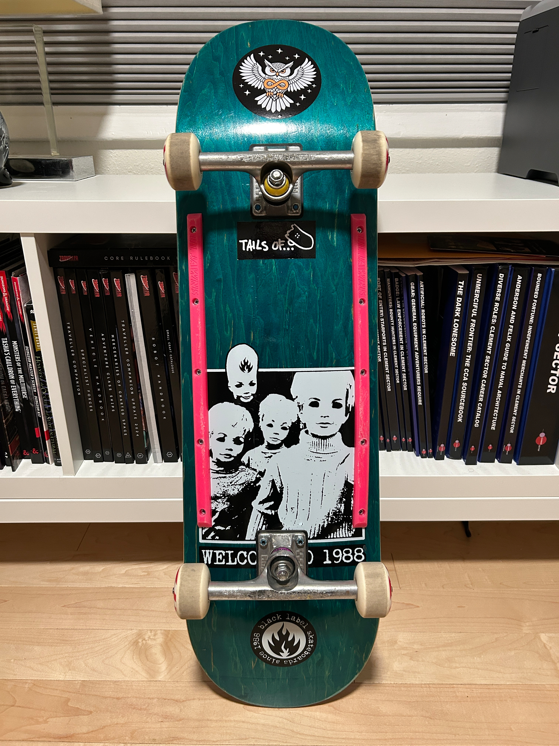 Black Label 9″ standard pops (14.5″ wheelbase), Ace 55 trucks, 54mm v1 103a Bones STF wheels. 1 thin riser under each truck, and Lil Jawns rails.