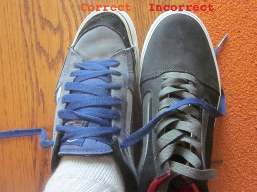 - I have heard that merchandisers prefer the incorrect method as it “looks better” on display. Well, OK, the do this in some fancy New York shoes store. Not in a skate shop, or the mall-approximation of a skate shop.